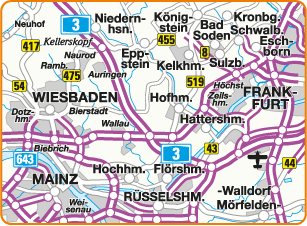 In der Karte „Unteres Maintal“ wird das Rhein-Main-Gebiet zwischen Wiesbaden und Frankfurt und von der Mainmündung bis zum Flughafen Rhein-Main abgebildet.