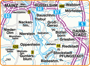 Die Rad- und Wanderkarte „Kühkopf/Hessisches Ried“ beinhaltet sowohl das Weinanbaugebiet südlich von Mainz, das Ried, der größte Trinkwasserspeicher der Region und das Gerauer Land, welches an das Europareservat Kühkopf angrenzt. Markierte Wege ermöglichen dem Radfahrer oder Wanderer dieses Gebiet zu erkunden.